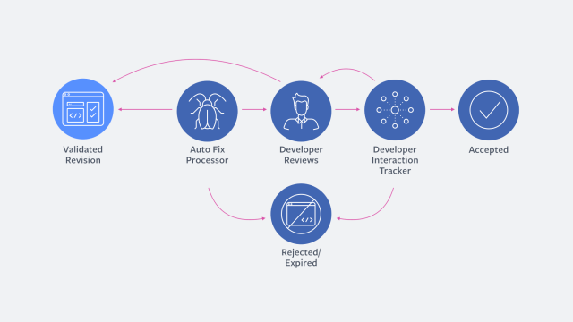 当修补程序经过全面测试之后,SapFix 会将它们发送给人类审查者进行审核。这非常类似于人工生成的报告由其他开发人员检查和批准的方式,除了系统自动跟踪审阅者的反馈外,它还会接受经批准的补丁,然后清理其他补丁。在某些情况下,SapFix 可以从几个选项中选择最佳解决方案,并向工程师提出建议。