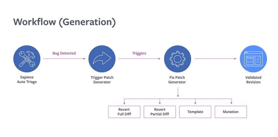 从发现 bug 到修复 bug,Facebook 有一套完整的流程:首先 Sapienz 以及 Facebook 的静态分析工具 Infer,会帮助定位代码中需要修补的点;一旦 Sapienz 和 Infer 精确定位与崩溃相关的特定代码部分之后,就会将该信息传递给 SapFix;最后,SapFix 会参考几种不同的策略,自动生成补丁。