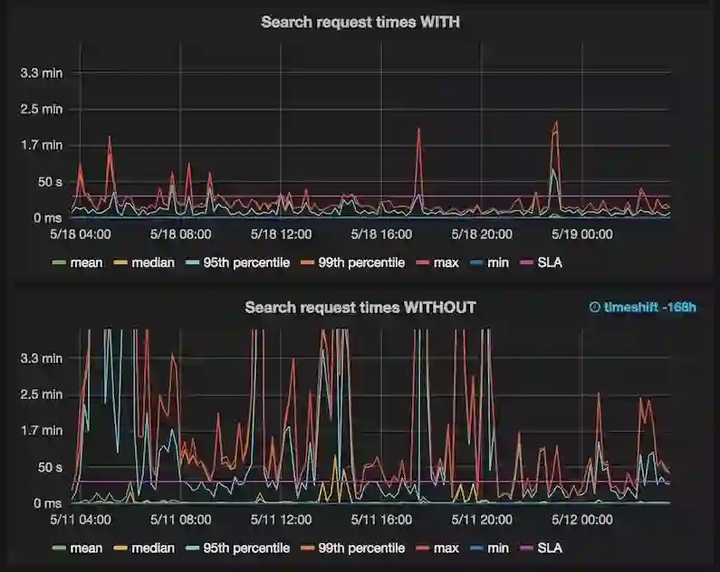 图表说明:响应时间。有 / 没有 重写 Lucene 查询执行。同时也表明不再有节点每天发生多次内存不足的情况。