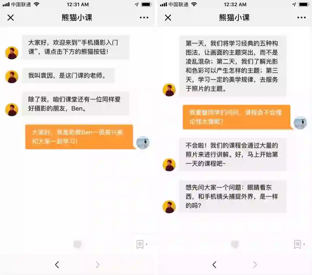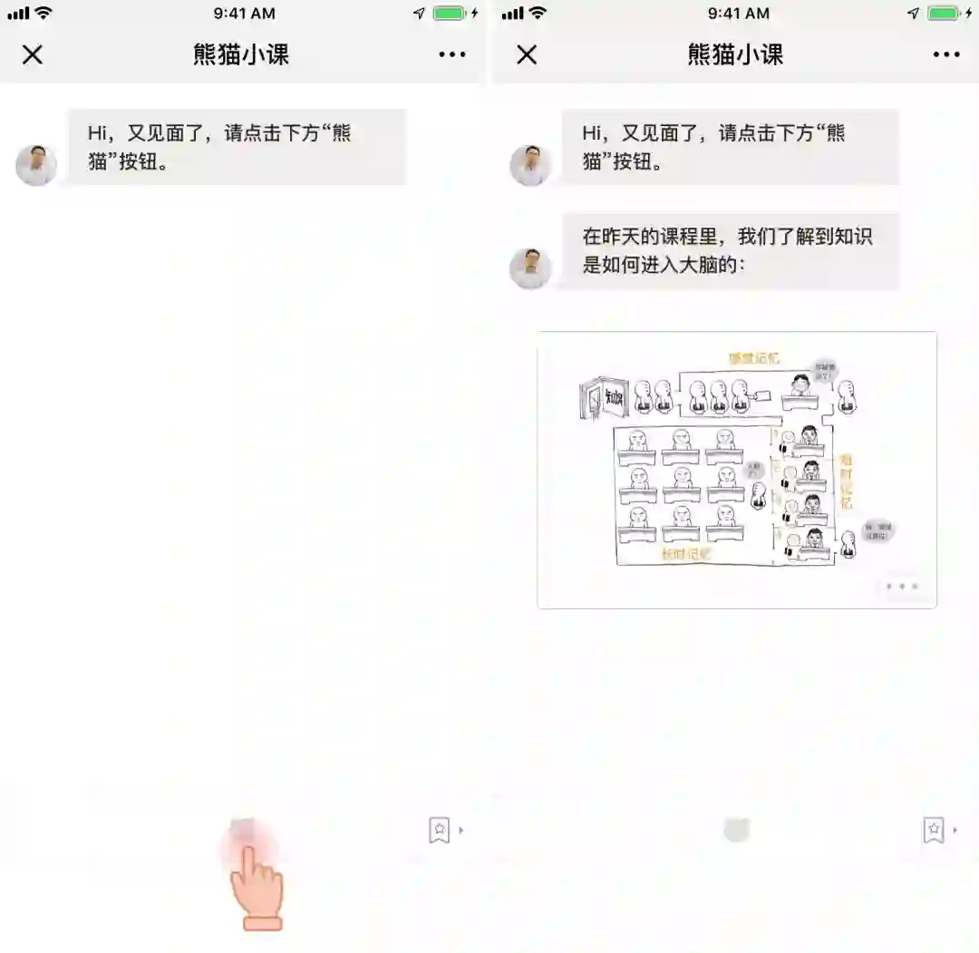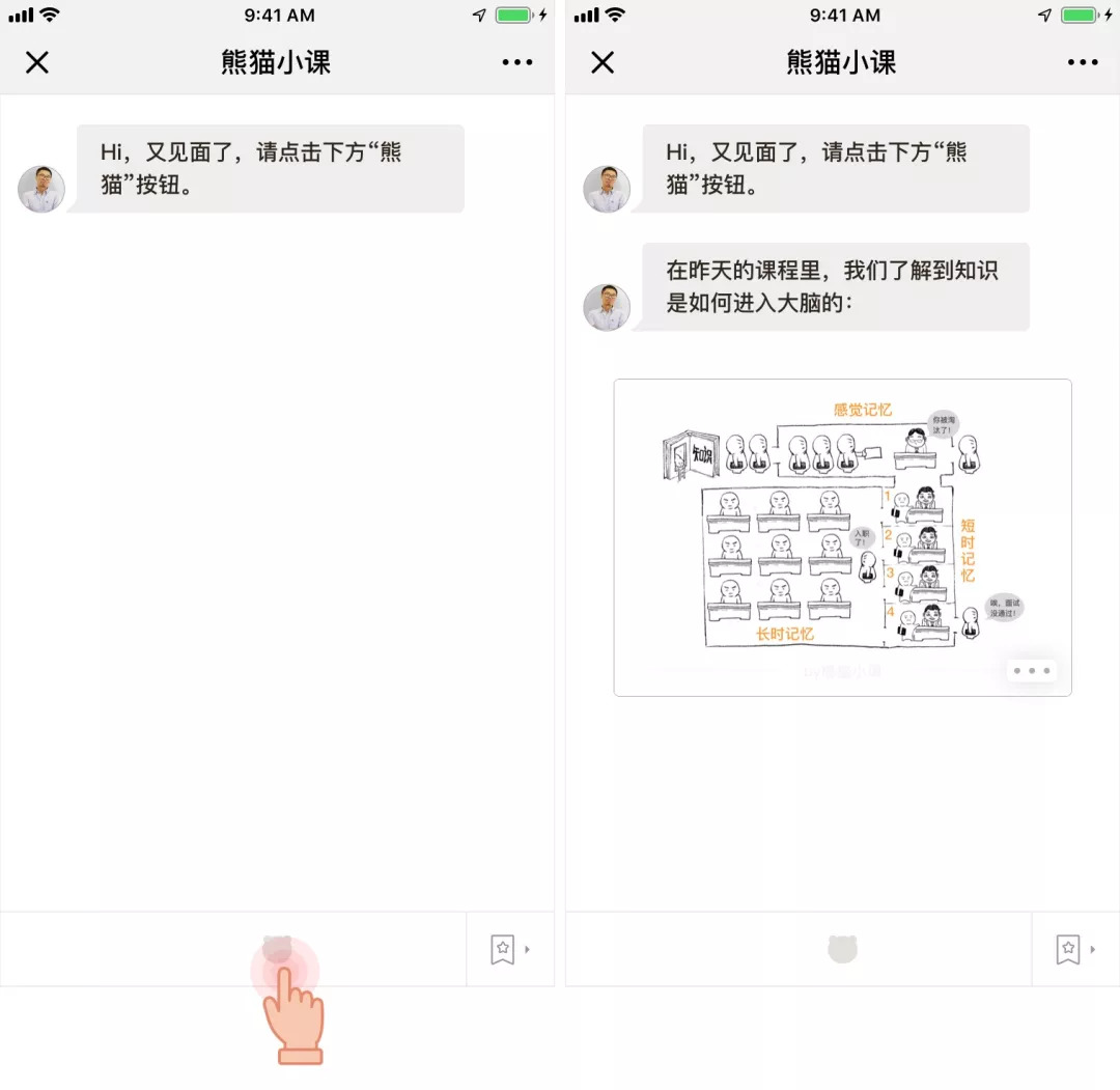 在熊猫小课中上课,就像在和老师一对一地聊天。它的界面很像我们熟悉的微信,课程内容被分成了一条一条的消息,我们每点一次底部的「熊猫按钮」,就出来一条新的消息。