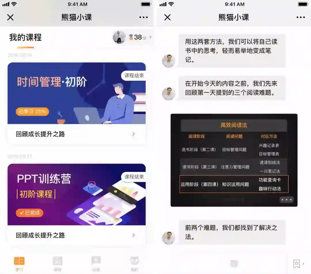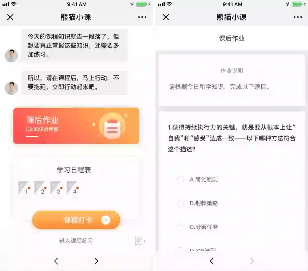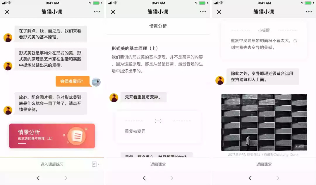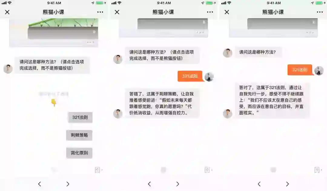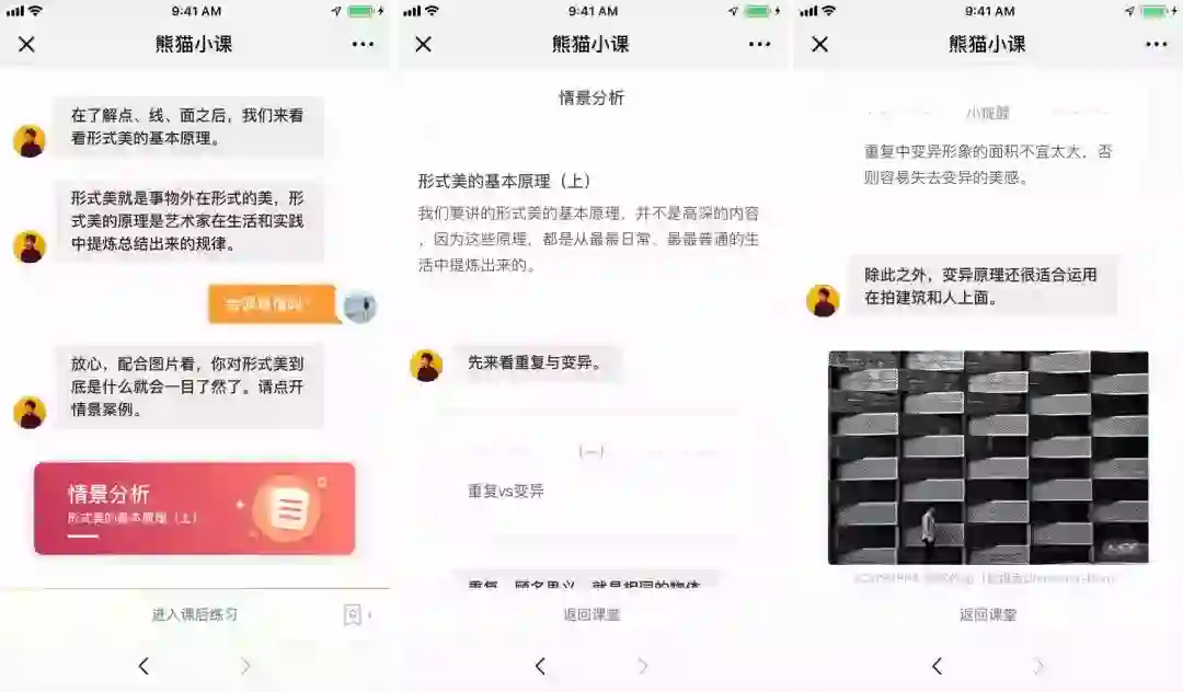 这样上课的好处是让我们不会有阅读压力,不会一点开就是大段大段的文字,上课节奏完全由自己把握,一条课程消息消化完了,再点下一条。熊猫小课不是一下把所有知识都扔你脸上,而是循序渐进地,一点一点按照你自己的节奏将知识传授给你。