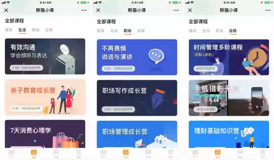 熊猫小课中的课程种类很丰富,有面向职场人士的演讲、思维导图、写作、管理等课程,也有带给我们自我提升的时间管理、手机摄影、理财等课程,还有贴近生活的心理学、亲子教育、沟通方式等课程。让你从多个方面提升和充实自己。