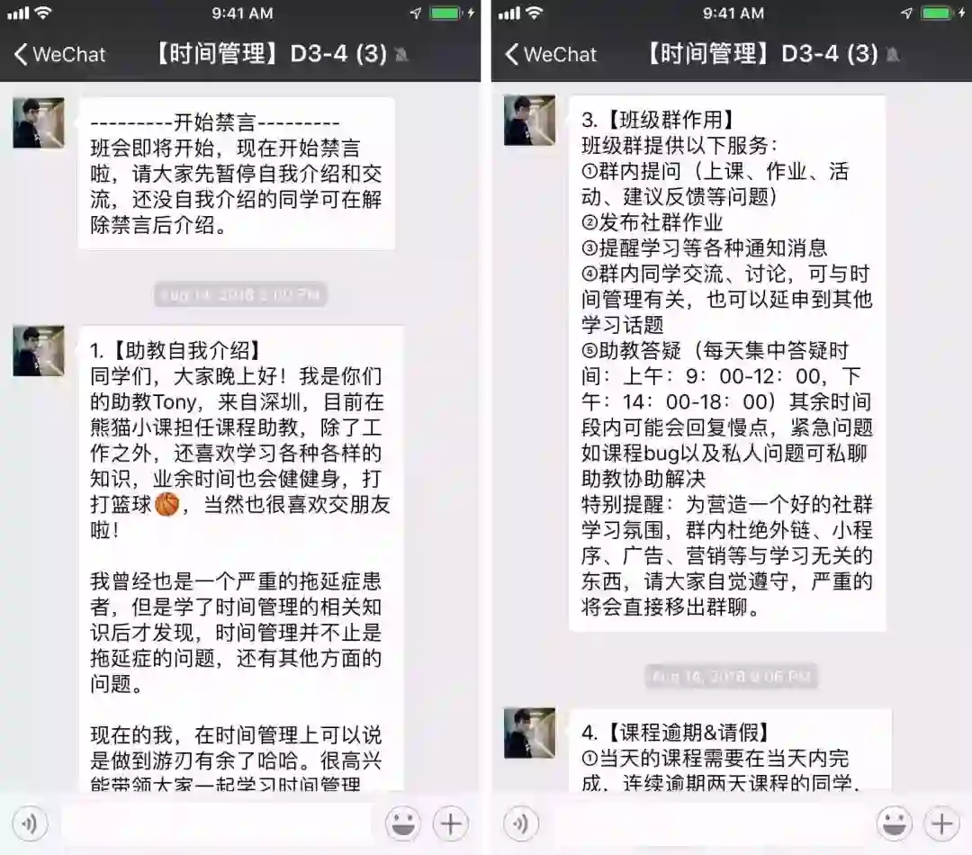 首先是刚入群时就有助教组织大家开班会,耐心地向大家说明课程安排以及参与方法。