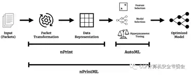 nPrint使不同流量分析工作的特征提取过程标准化,AutoML旨在自动化特征选择、模型选择和超参数调优,以便为给定的特征和带标签数据集找到最优模型。最终,nPrint为每个网络流量分析任务提取最佳特征,AutoML用于确定最佳模型和超参数。