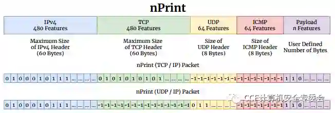 以上两种表示方法都无法满足统一化表示数据的需求,如图2所示,研究人员结合语义表示法和朴素二进制表示法提出一种统一的网络数据包表示方法nPrint。首先,它会保证任何数据包都可以被完整表示而不丢失任何信息;然后,使用内部填充确保每个数据包以相同数量的特征表示,并且每个特征具有相同含义,这种在位级上可解释的表示使我们能够更好的理解模型;其次,直接使用数据包的位,区分于某个位被设置为0,将不存在的包头用-1填充;最后,每个数据包都用相同数量的特征表示,对于给定的网络流量分析任务,将载荷设置为可选的字节数。此外,nPrint具有模块化和可扩展的特性,不仅可以将其他协议添加到表示中,也可以将一组数据包表示串联起来构建多包的nPrint指纹。