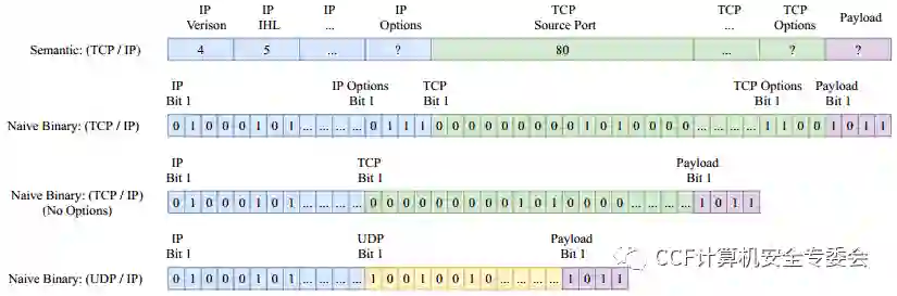 (2)朴素二进制表示法:使用数据包的原始位图表示来保持顺序,但是忽略了不同的大小和协议,导致两个数据包的特征向量对同一特征具有不同的含义,这种不对齐可能会在重要特征的地方引入噪声而降低模型性能,同时也因为无法将每一位都映射到语义上而导致不可解释。