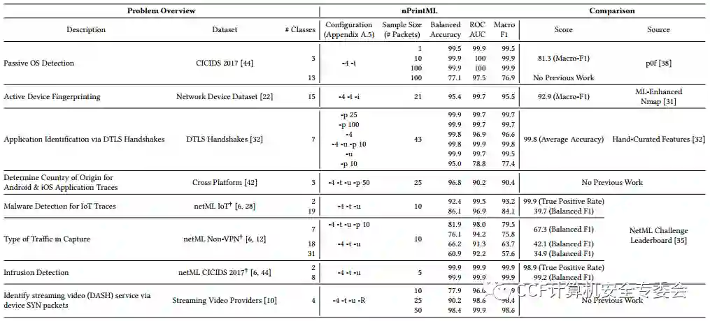 针对8个网络流量分析场景,图4展示了用nPrintML进行分析的案例研究,实验结果表明,nPrintML不仅可以解决不同场景的网络流量分析问题,并且具有相较于传统方法更好的性能。