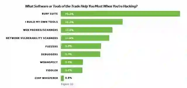 14.近 30% 的白帽子受访者表示,他们使用 Burp Suite 来找漏洞 。其他测试工具排行见下图: