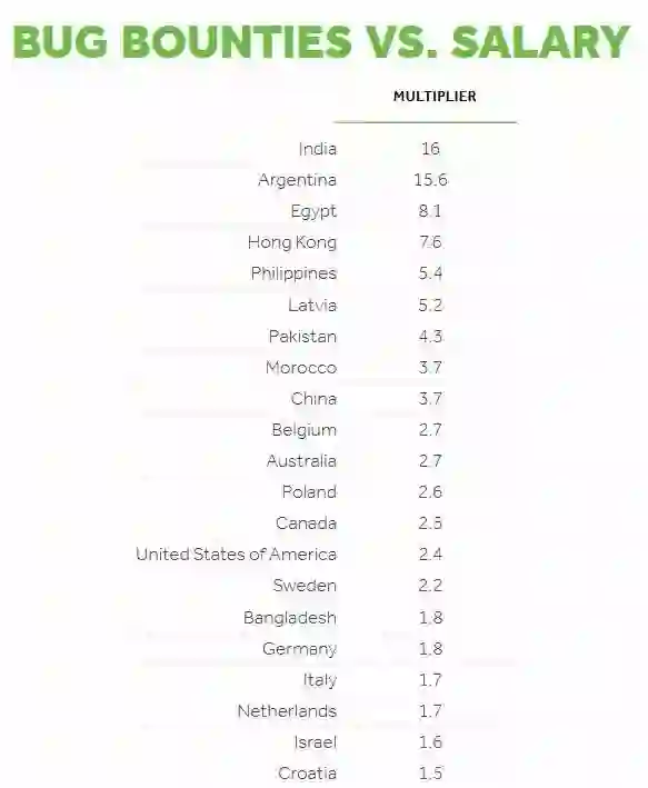 HackerOne 的报告显示,在印度成为一名挖漏洞的白帽子是非常不错的,顶尖的白帽子比软件工程师平均工资高出 16 倍。