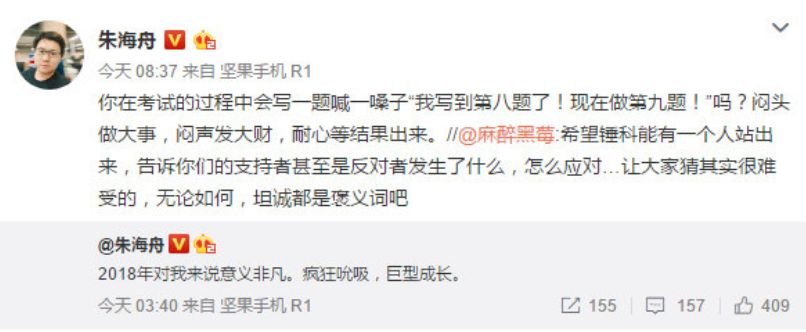 12 月 25 日,也就是锤子科技成都公司变成国税局的消息传出之后,锤子科技产品经理朱海舟在凌晨三点多发布了一条微博:“2018 年对我来说意义非凡。疯狂吮吸,巨型成长。”