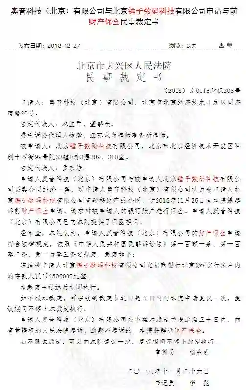 北京市大兴区人民法院民事裁定书显示,申请人奥音科技 (北京) 有限公司与被申请人北京锤子数码科技有限公司买卖合同纠纷一案,现申请人奥音科技 (北京) 有限公司认为被申请人北京锤子数码科技有限公司有转移财产的企图,于 2018 年 11 月 26 日向北京市大兴区人民法院提起诉前财产保全申请,请求对被申请人的银行账户进行保全。申请人奥音科技 (北京) 有限公司已向法院提供了保函担保。