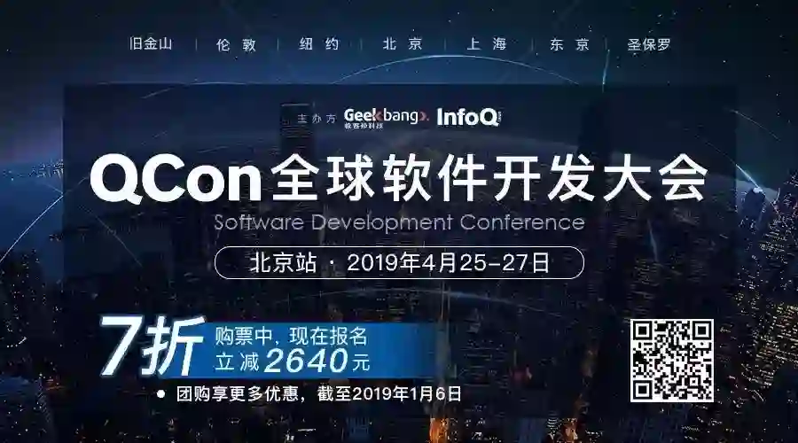 2019 年 4 月 25-27 日,QCon 与您相约北京国际会议中心,深度解析业界前沿领域及技术趋势。100+ 领袖大咖集结,海量经典实践案例,高品质干货触手可及!点击 「阅读原文」 或识别二维码了解 QCon 十周年精心策划,早鸟 7 折立减 2640 元,有任何问题欢迎联系票务小姐姐 Ring:电话 010-53935761,微信 qcon-0410