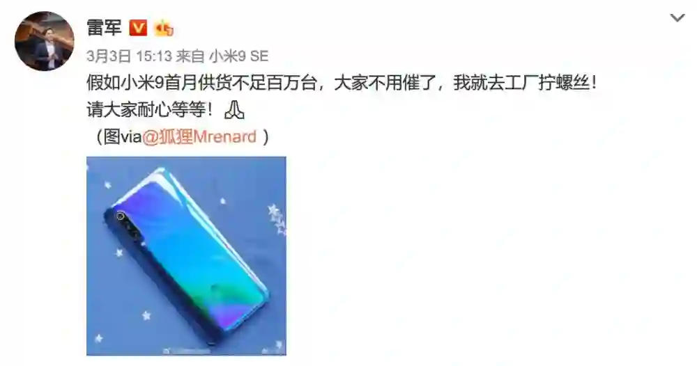 雷军每天发布微博的数量有了明显的提升,发布会预热勤勤恳恳,还和王源粉丝们亲密互动,并且屡屡爆出非常能吸引眼球的言论,比如立下“供货不足百万台,就去拧螺丝”的 flag,当然我们都知道这不可能兑现,因为谁也没办法去查证供货的数字具体到不到一百万台,人家工厂也不可能真让你拧螺丝。但就是这样简单粗暴的方式,把小米现货的决心一下子给表达出来了。