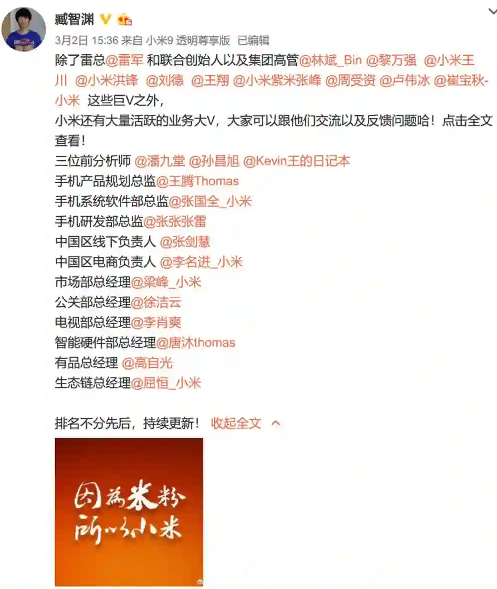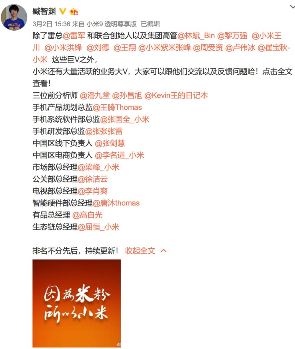 另外,从“生死看淡,不服就干”开始,小米的营销策略也在今年发生了很大的改变,简单概括一下就是“全员 KOL 化”,上至雷军、林斌,下至部门总经理,全员上阵进行社会化(主要是微博)营销,人均“大V”。这让小米在微博上有了极高的声量,在出现一些争议话题(比如“真假” 4800 万像素)时,官方亲自下场,炒起热度。