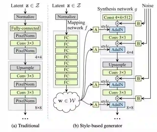 StyleGAN中运用到的生成式对抗网络(GAN, Generative Adversarial Networks )是一种深度学习模型,是近年来复杂分布上无监督学习最具前景的方法之一。