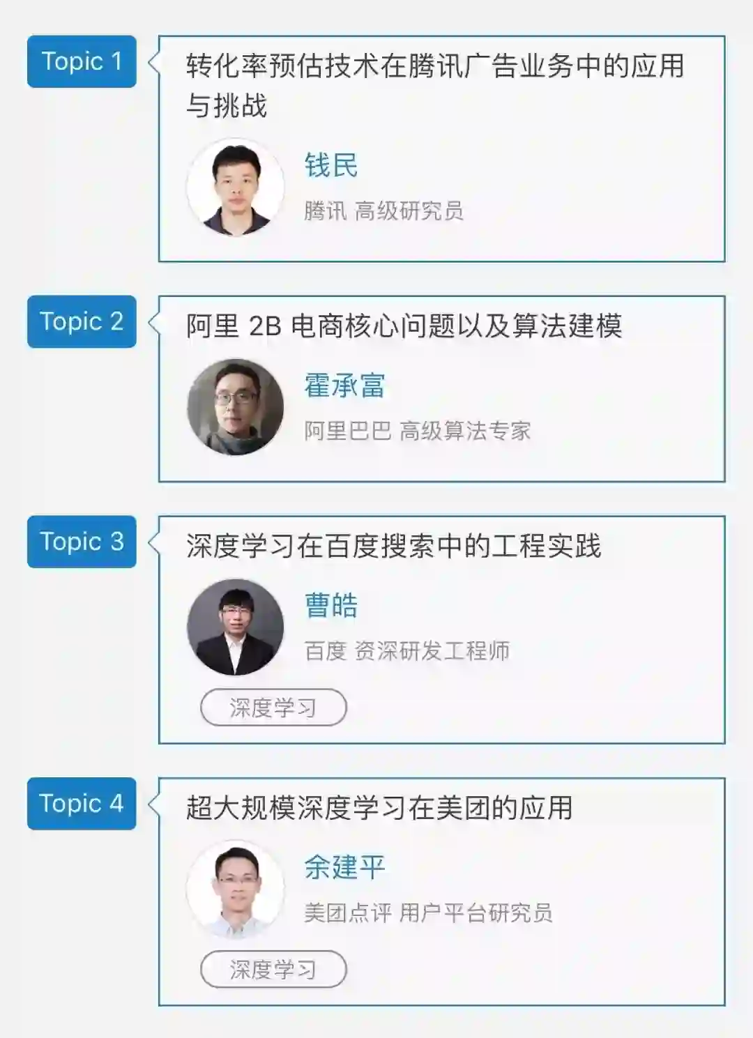 本专题将深入介绍在不同的业务场景下机器学习技术的应用与实践,包括面对具体业务的问题建模,针对相应业务属性和阶段的技术选型与演进,以及背后支撑的大规模机器学习平台技术架构,希望这些实际落地经验能够让听众有所收获。