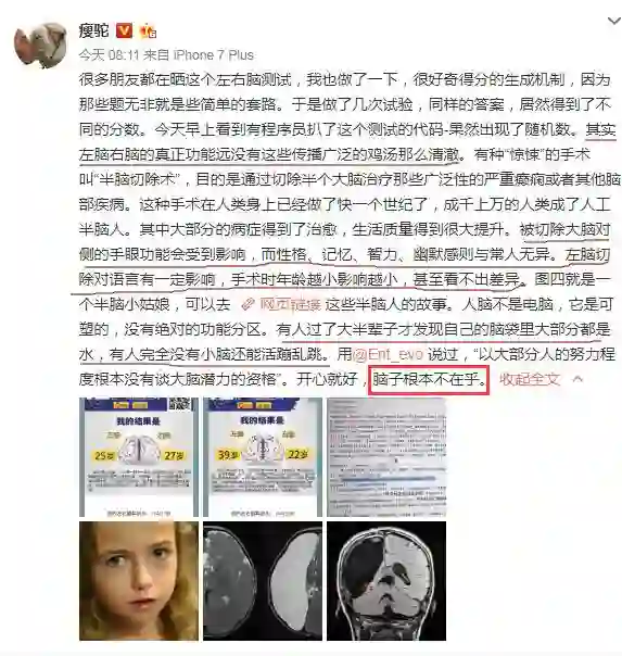 除此之外,有果壳网的主笔@瘦驼在微博分享了自己对于这个测试的见解。他在微博写道“左脑右脑的真正功能远没有这些传播广泛的鸡汤那么清澈...”,随后还举例了进行“半脑切除术”的例子。