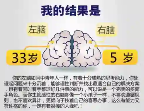 近日小编的不少微信群包括朋友圈无一幸免的被一个测试给刷屏了。仔细一瞅,“你的左右脑分别有几岁?”啥玩意儿?我和我的左右脑朝夕相处了这么多年,我都不太清楚的事情,你一个测试能给我测出来?