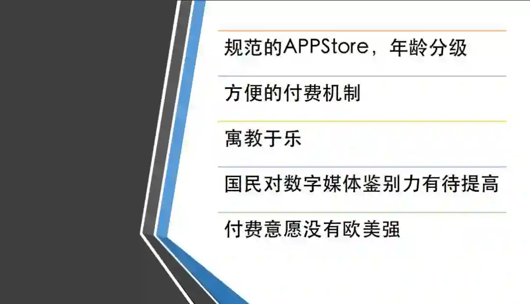 张老师最后总结了苹果的APP store下载使用APP学习的优势——有年龄分级、方便的付费机制,寓教于乐,也提出了国民对数字媒体鉴别力有待提高,付费意愿没有欧美高这两方面的问题。