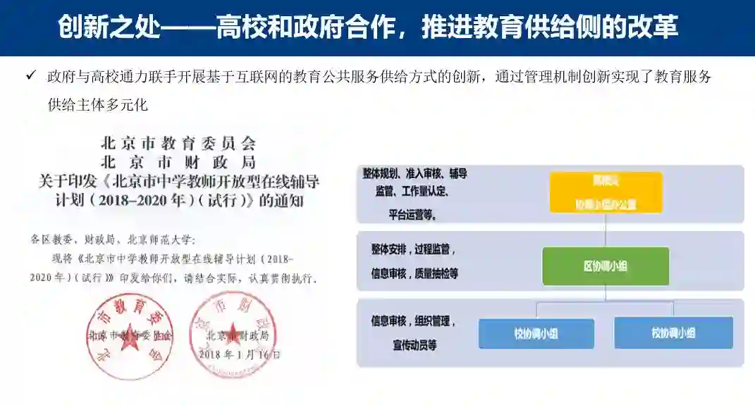 同时双师服务跨越学校和区域边界,为每一位学生平等提供接受北京市各区优秀教师辅导的机会,扩大了优质教师资源的影响范围,实现区域教育的均衡配置,有效地促进了教育公平。政府与高校通力联手开展基于互联网的教育公共服务供给方式的创新,通过管理机制创新实现了教育服务供给主体多元化。双师服务实行师资流动机制,使教育服务质量、学生在线学习得到保障。