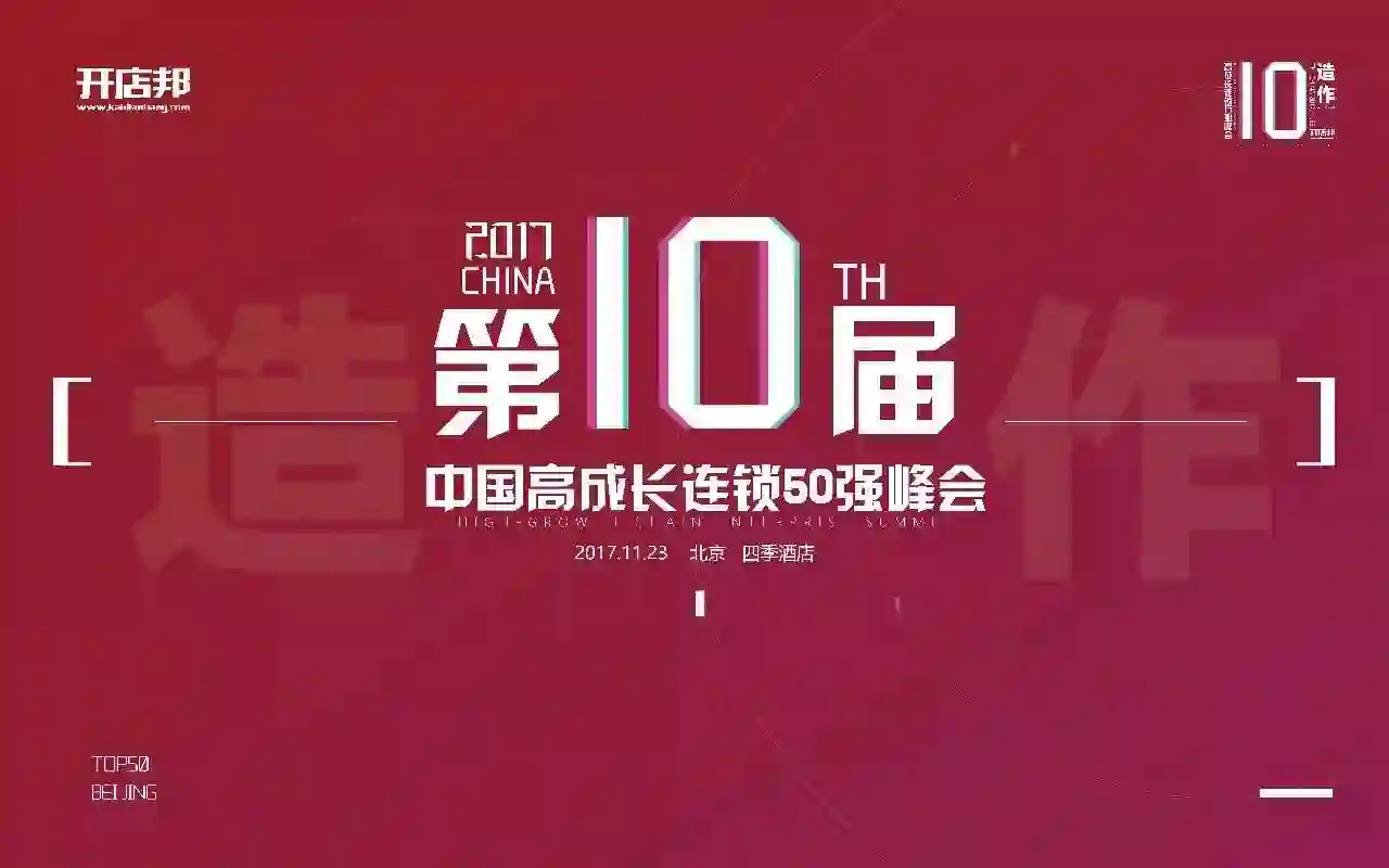 开店邦每年一期的“中国高成长连锁50强”榜单,不仅在于告知连锁行业的发展新锐与成长之星,更多是发现一种趋势,服务于更广泛的连锁品牌和创业投资者,了解市场动态,洞悉行业舆情,更准确、更高效地实现投入产出的正向回报。11月23日,开店邦主办的第十届中国高成长连锁企业峰会暨2017年中国高成长连锁品牌颁奖典礼将在北京四季酒店隆重开幕。上榜的优秀企业家、行业观察家、投资界大咖等近千人欢聚一堂,共同交流与探讨行业发展趋势,分享企业成功经验。
