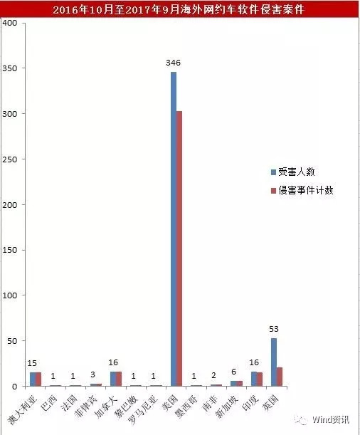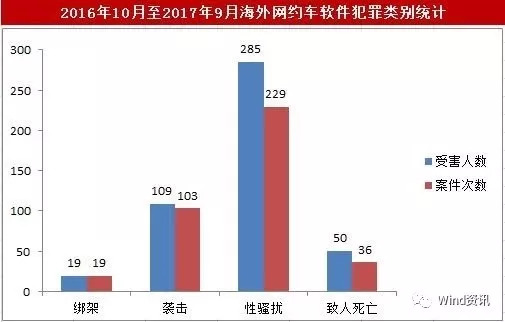 Wind梳理公开数据发现,仅2016年10月至2017年9月发生的与海外网约车软件相关的侵害案件,就导致109人遭袭击、19人遭绑架、50人死亡,另有285人遭到性骚扰。
