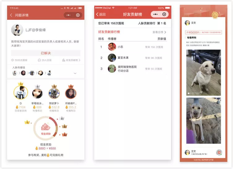 “立问人脉”曾多次在朋友圈刷屏,产品的逻辑是,在知识付费问答的基础上,结合悬赏机制裂变朋友圈传播。“依据六度人脉原理,通过朋友传快速找到解决问题的人”,发布者可以通过悬赏发布问题,最终问题解决时,整个分享链上的用户都可以分得奖赏。报酬的金额多少取决于用户的人脉质量,离问题解决者越近获得的赏金比例越高。