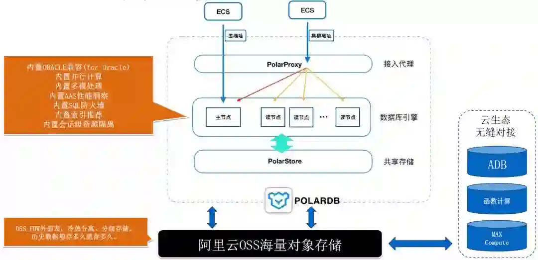 POLARDB v2.0 可以将OSS作为数据存储,用户通过创建oss_fdw外部表插件,建立OSS外部表,可以将数据写入OSS,也可以从OSS读取。采用标准的SQL接口。