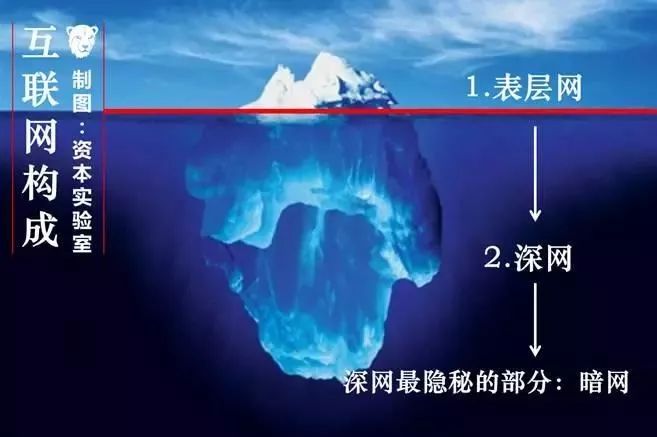 这张图试图向我们说明:普通人所能访问到的表层网络仅仅只是整个互联网的冰山一角;而绝大多数人不知道,或者不具备访问能力的深层网络,比表层网大了好几个数量级;深网占据了整个互联网信息和数据的96%。