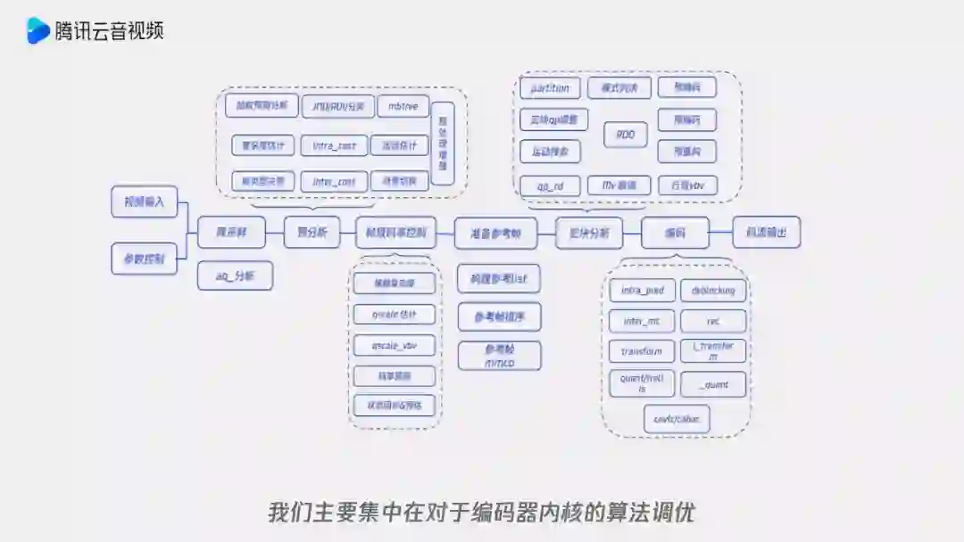 腾讯明眸的整体处理 pipeline 也与普通媒体处理的流程有较大的区别,在视频解码后,我们会先进行场景分析、毛刺检测、噪声检测、交错检测等预分析流程,来分析视频源的画面质量,然后针对不同的场景和画面质量情况,使用对应的画质增强 / 修复技术。在对视频源进行修复之后,腾讯明眸会对画面进行二次分析,来辅助后续的视频编码流程,这里会分析视频的 ROI/JND 信息,内容自适应编码信息等,最后利用这些信息来进行更符合人眼主观的编码流程,在编码过程中,我们也对编码内核进行了深入的优化,在腾讯内部多个部门通力合作下,自研了 O264/V265/TXAV1/O266 等编码器,相比开源编码器极大的提升了视频压缩率。