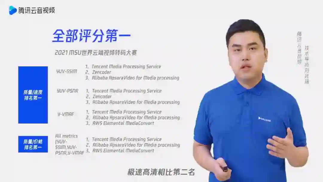 在编码器内核方面,腾讯明眸·极速高清引入了很多领先的技术。2021 年的 MUS 云端编码大赛上,腾讯明眸取得了多项第一的成绩,尤其在视频编码质量评测上,相比第二名有 20% 的编码增益。除此之外,在 H.266/VVC 等下一代编码器上,我们也拥有 100 项以上的专利。