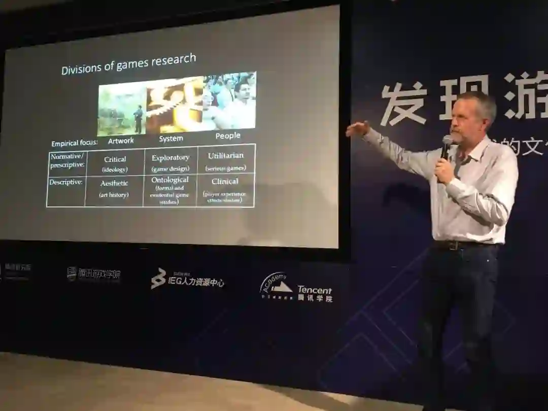 Espen Aarseth教授:感谢大家的盛情邀请,非常高兴能够有机会到腾讯这样一个重要的游戏公司。今天我想和大家共同探讨一下游戏和游戏使用者的研究,包括我们是如何研究游戏对人的影响、游戏的本质是什么、游戏是否真的会使人成瘾以及我们应该如何对待游戏。