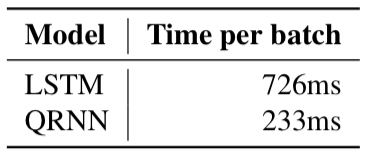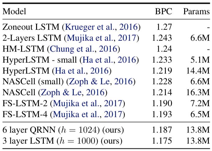 QRNN和LSTM以完全不同的方式对顺序数据进行操作。对于单次级别的语言模型,QRNN能用LSTM的一小部分成本进行类似的训练和泛化。然而,在我们的工作中,我们发现QRNN在字符级任务中不太成功,即使进行了大量超参数调整。下图是LSTM和QRNN在单词级和字符级任务中的表现比较: