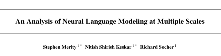 语言建模的许多方法都具有新奇复杂的结构。我们采用现有的基于LSTM和QRNN的最先进的词级语言模型,并将它们扩展到更大的词汇表及字符级模型中。经过适当调整后,LSTM和QRNN分别在字符级数据集(Penn Tree-bank, enwik8)和单词级数据集(WikiText-103)上表现出了最佳结果。只用一个GPU,在12小时至2天的时间里即获得了结果。