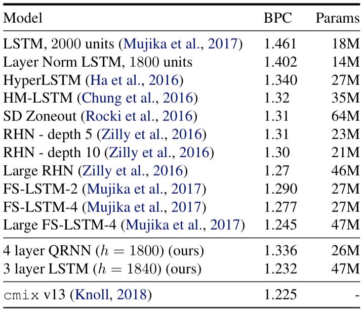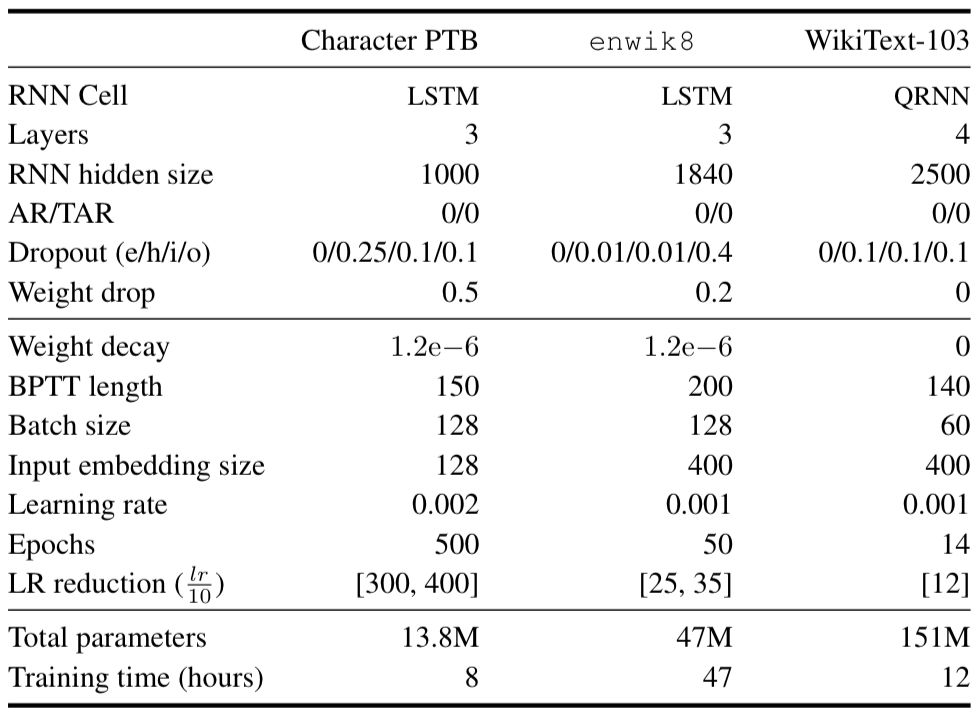 Hutter Prize Wikipedia数据集(即enwik8)是一个字节级数据集,有维基百科XML转储的前一亿字节组成。在该数据集上,模型使用了三层LSTM,BPTT的长度为200,嵌入尺寸400,隐藏层尺寸为1850。最终实验结果如下:
