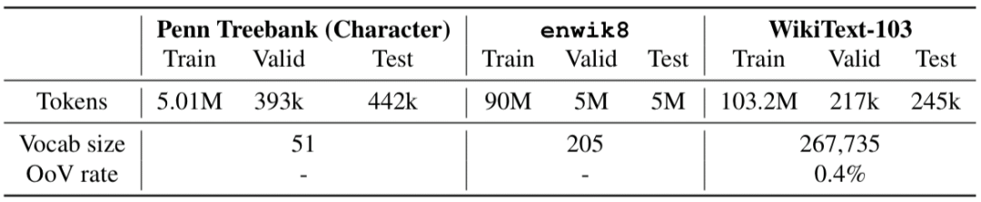 试验在三个数据集上进行,两个字符级数据集(Penn Treebank和enwik8),一个大型单词级数据集(WikiText-103)。