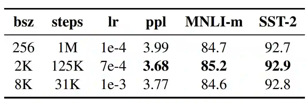神经机器翻译领域之前的工作表明,在学习率适当提高时,以非常大的 mini-batch 进行训练可以同时提升优化速度和终端任务性能。最近的研究表明,BERT 也能适应大批量训练。