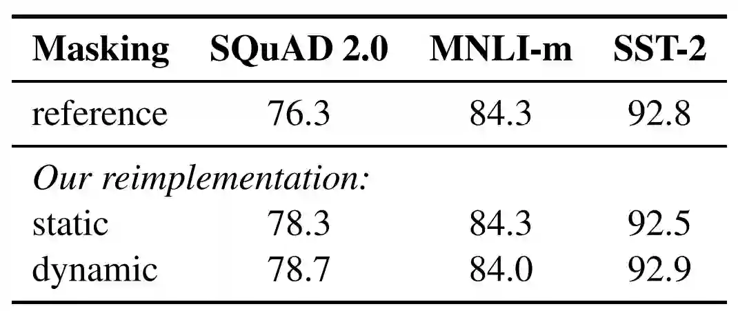 BERT 依赖随机掩码和预测 token。原版的 BERT 实现在数据预处理期间执行一次掩码,得到一个静态掩码。Facebook 研究者将该策略与动态掩码进行比较,动态掩码即,每次向模型输入一个序列时都会生成掩码模式。在预训练进行更多步或使用更大的数据集时,这点变得尤其重要。