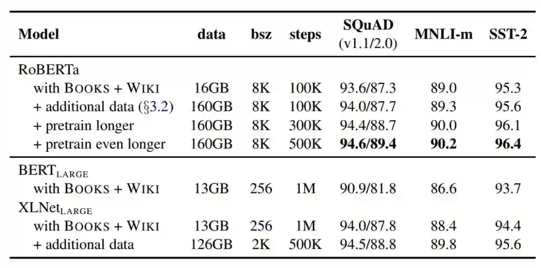 表 4:随着训练数据的增大(文本数量从 16GB → 160GB)、训练步长的增加(100K → 300K → 500K 训练步),RoBERTa 在开发集上的结果。在对照试验中,表格中每一行都累积了前几行的改进。