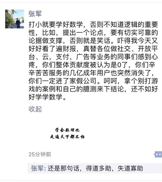 在全国人民欢度冬至吃饺子的大喜日子里,阿里公关与腾讯公关打起来了。阿里公关老大王帅说,腾讯的整条命都是小学生给的;腾讯公关总监张军立马发朋友圈,说王帅老师数学不好,我们鹅长还有广告等其他业务收入。