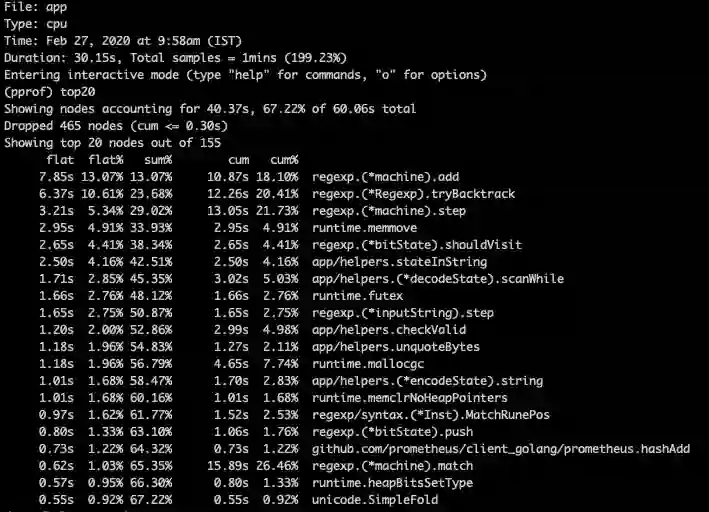 通过分析 Go 解析服务,我们能定位出问题区域,更好地理解我们的服务,并决定在哪里(如果有的话)投入时间来做改进工作。大多数性能分析工作最终都会参照用户使用情况对阀值或配置进行调优,从而获得更好的性能。