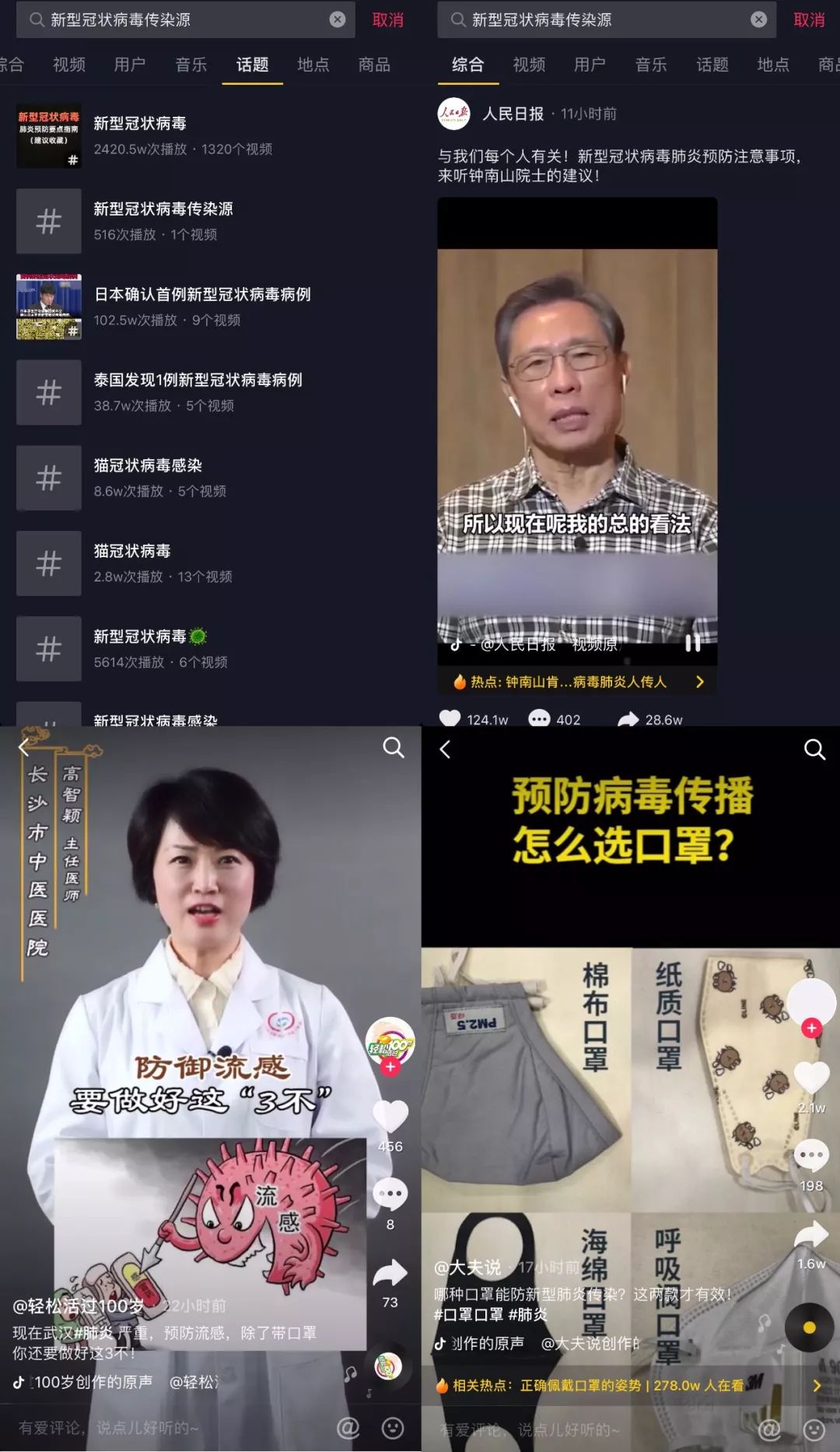 与病毒相关的最新新闻热点,也能在短视频上得到第一时间的传播,让肺炎事件得到更多人的关注与紧张。