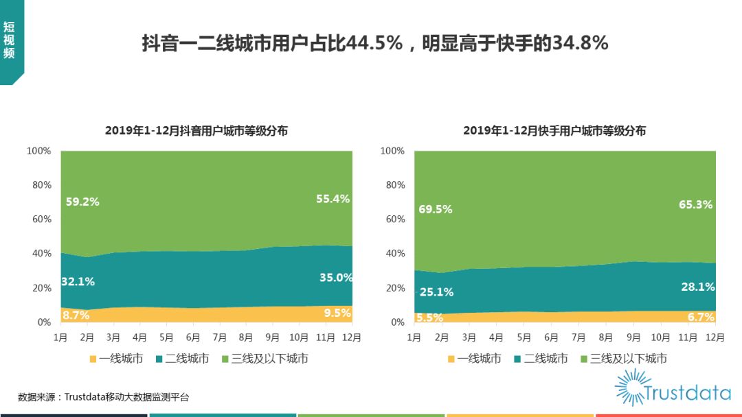 Trustdata最新数据显示,抖音的三线及以下城市用户占比55.4%,而快手的三线及以下城市用户占比65.3%,下沉市场依旧存在较大机会,由于下沉市场与年轻人市场有部分重合,也让快手抖音在春节的营销玩法上,也更偏重于年轻姿态。