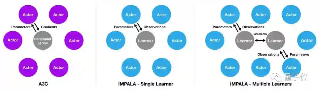 IMPALA的灵感来自于热门的A3C架构,后者使用多个分布式actor来学习agent的参数。在类似这样的模型中,每个actor都使用策略参数的一个副本,在环境中操作。actor会周期性地暂停探索,将它们已经计算得出的梯度信息分享至中央参数服务器,而后者会对此进行更新。