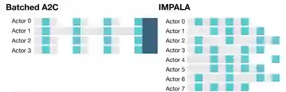 不过操作和学习的解耦也导致,actor的策略落后于learner。为了弥补这样的差距,我们引入了离策略优势actor-评价者公式V-trace。它弥补了离策略actor获得的轨迹。你可以从我们的论文中了解算法及其分析细节。