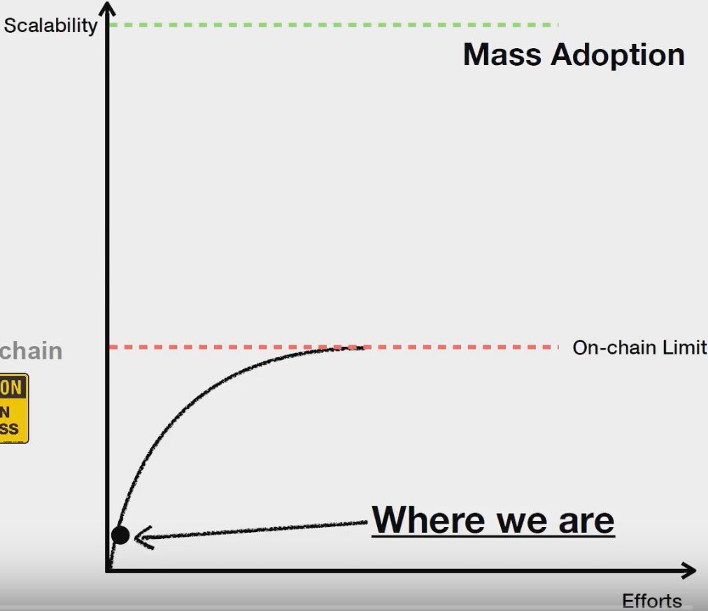 但正如这张图显示的,如果我们只关注 on-chain limit 的话,发展到一定程度后,我们的收益是递减的。说到底,区块链仍然是关于 “如何取得共识” 的一致性算法,而一致性算法不可避免地会遇到效率问题。如果说区块链技术大规模普及所要求的速度是最上面那根绿色的线的话,以现有方式的可扩展性是无法达到的。