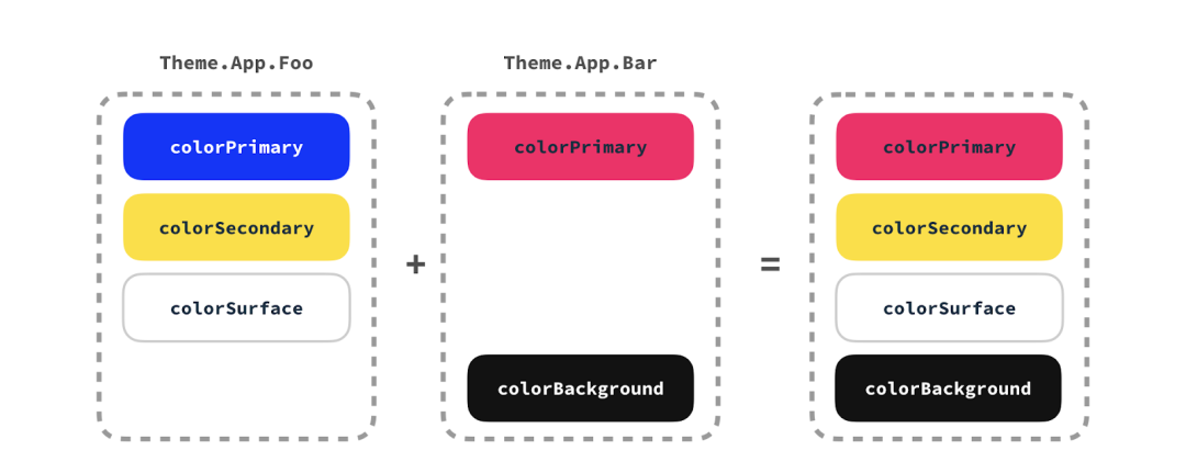 <!-- Copyright 2019 Google LLC.SPDX-License-Identifier: Apache-2.0 --><ViewGroup …- android:theme="@style/Theme.App.Foo">+ android:theme="@style/ThemeOverlay.App.Foo"><Button …- android:theme="@style/Theme.App.Bar"/>+ android:theme="@style/ThemeOverlay.App.Bar"/></ViewGroup>