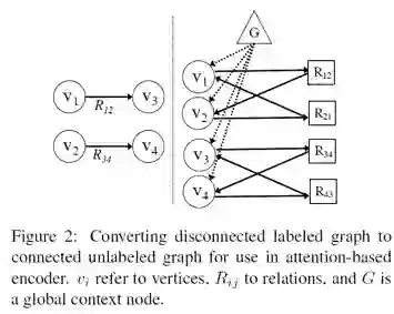 预先准备为了进行编码,作者将图谱重构为一种无标注的连接图,实体和关系都为图中的节点,下图左为一般的知识图谱三元组形式,右边为重构的图结构。可以看到,每个三元组都被替换为两个“实体->关系/关系->实体”的有向图,同时为了保留未连接实体之间的信息流(information flow),作者设置了一个全局结点G指向所有的实体节点。