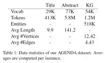 AGENDA数据集的相关统计参数如下图所示,作者将数据集切分为38720规模的训练集,1000验证集与1000测试集