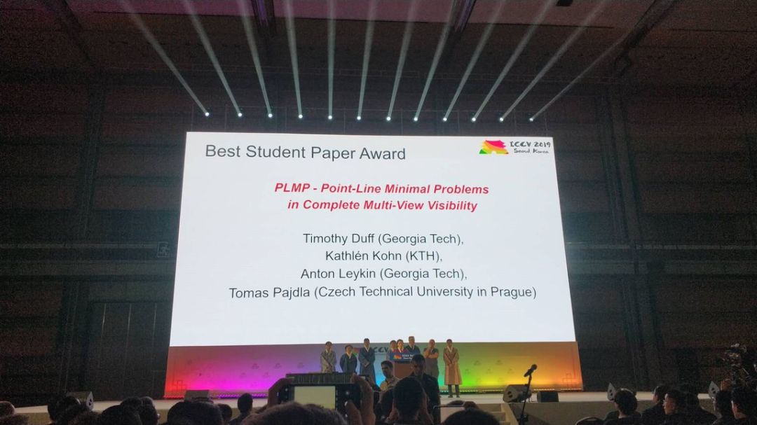 ICCV 2019 最佳学生论文奖由《PLMP-Point-Line Minimal Problems in Complete Multi-View Visibility》摘得,论文作者分别来自佐治亚理工学院(Georgia Tech)、瑞典皇家理工学院(KTH)以及捷克理工大学(Czech Technical University in Prague)。